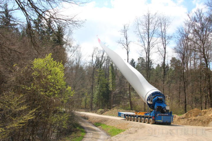 Schon der Transport der Rotorblätter vom Lagerplatz im Oberdorf von Wiechs in den Wald hatte es in sich. Die aus speziellem Kunststoff angefertigten Teile wurden auf einem selbst fahrenden, langen Last-Transporter angeliefert. „Die Flügel mussten schräg gestellt werden, damit sie möglichst wenig dem Wind ausgesetzt waren“, schildert Christoph Tonder, Projektleiter bei Solarcomlex. Ein ferngesteuerter, gut 160 Meter hoher Kran verrichtete dann Maßarbeit. Gesichert durch Seile ging es in die Höhe. Spannung lag in der Luft, bis die Rotorblätter mit Stehbolzen an ihrer Spitze an die Nabe des Stahlrohrs über dem Maschinenhaus erfolgreich angedockt hatten. „Eine derartige Aktion ist aufgrund der riesigen Dimension auch für mich Neuland“, erklärt Christoph Tonder, der schon in Rheinland-Pfalz den Bau von Windkraft-Anlagen leitete.